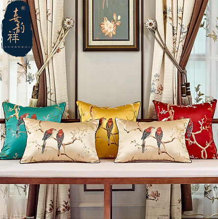 Housse de coussin chinois brodé avec des oiseaux et des plantes. De couleur bleue émeraude. Dimensions : 450mm/450mm. Housse de coussin haute gamme.